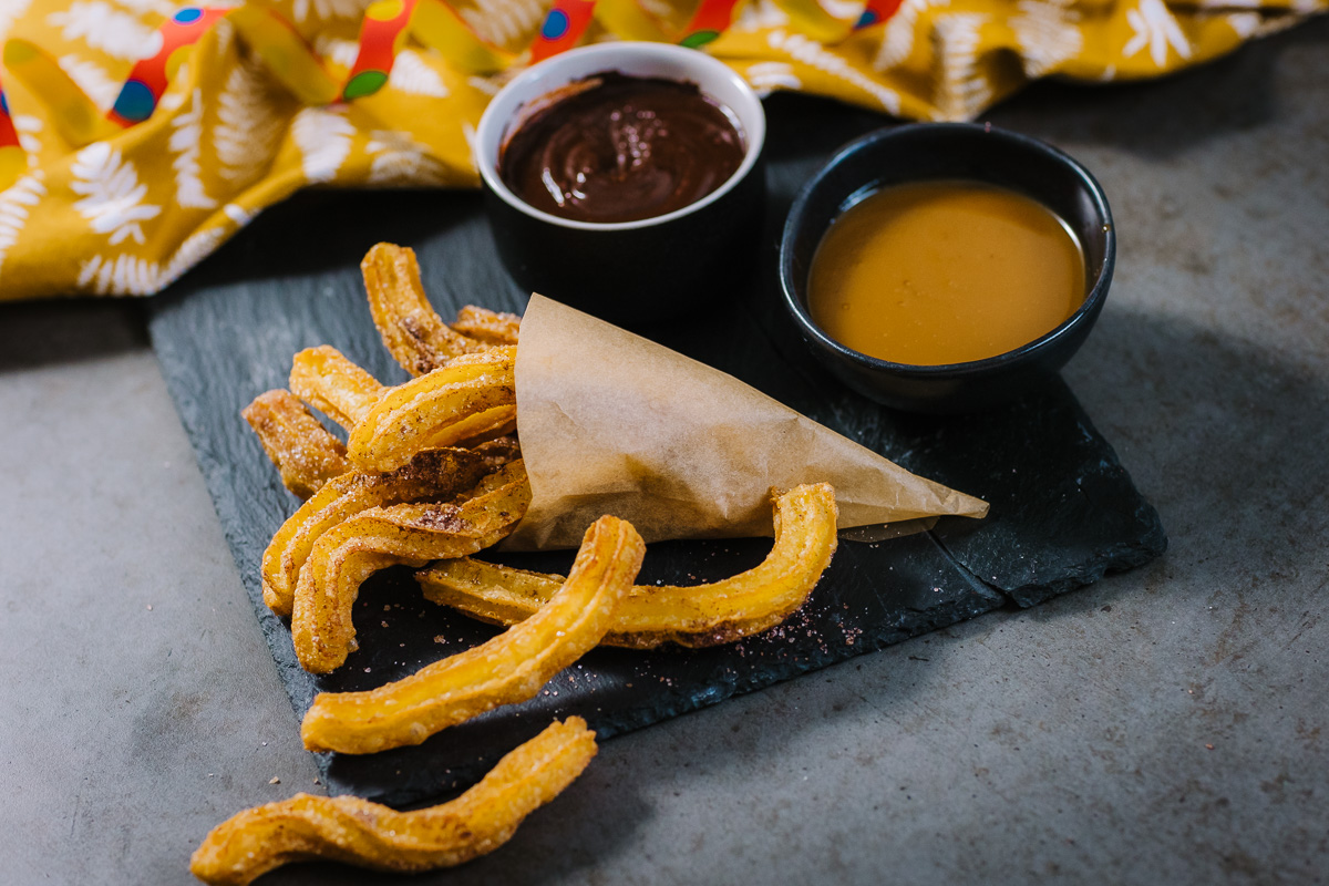 Churrosi so izvrstna španska sladica. Njihova priprava je enostavna, na pogled so srčkani, medtem ko je njihova hrustljava popolnost s sočno notranjostjo vedno odlična izbira za ljubitelje ocvrtih sladic. Pogosto se postrežejo z različnimi pomakami, kot so čokolada in/ali karamela. Tokrat smo se odločili za rahlo pikantno različico.