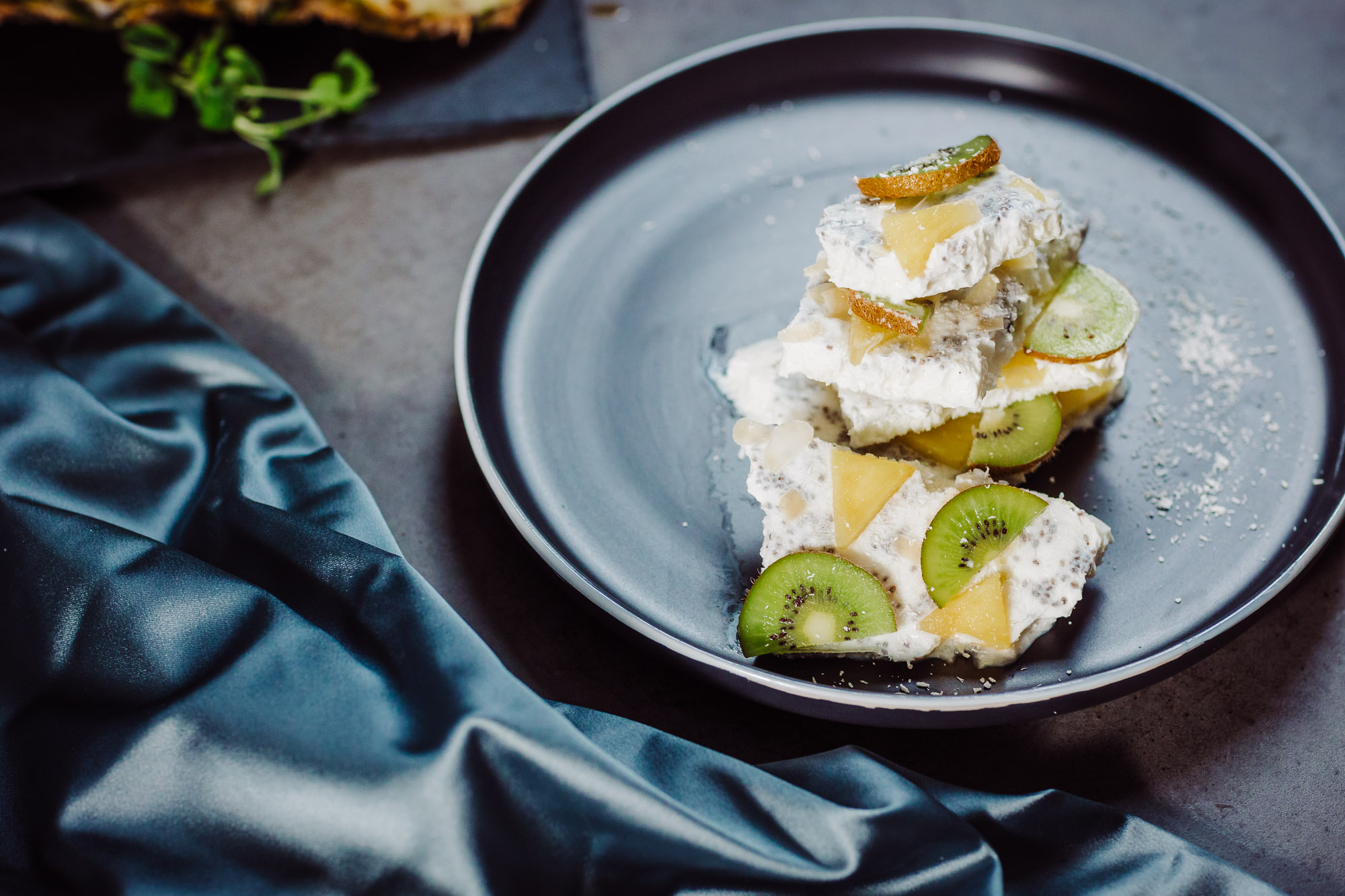 V skledi zmešamo LCA proteinski jogurt, med in kokosovo moko. Vlijemo v pekač in enakomerno razporedimo. Na vrhu razporedimo chia puding, koščke ananasa, narezan kivi in mandljeve lističe.