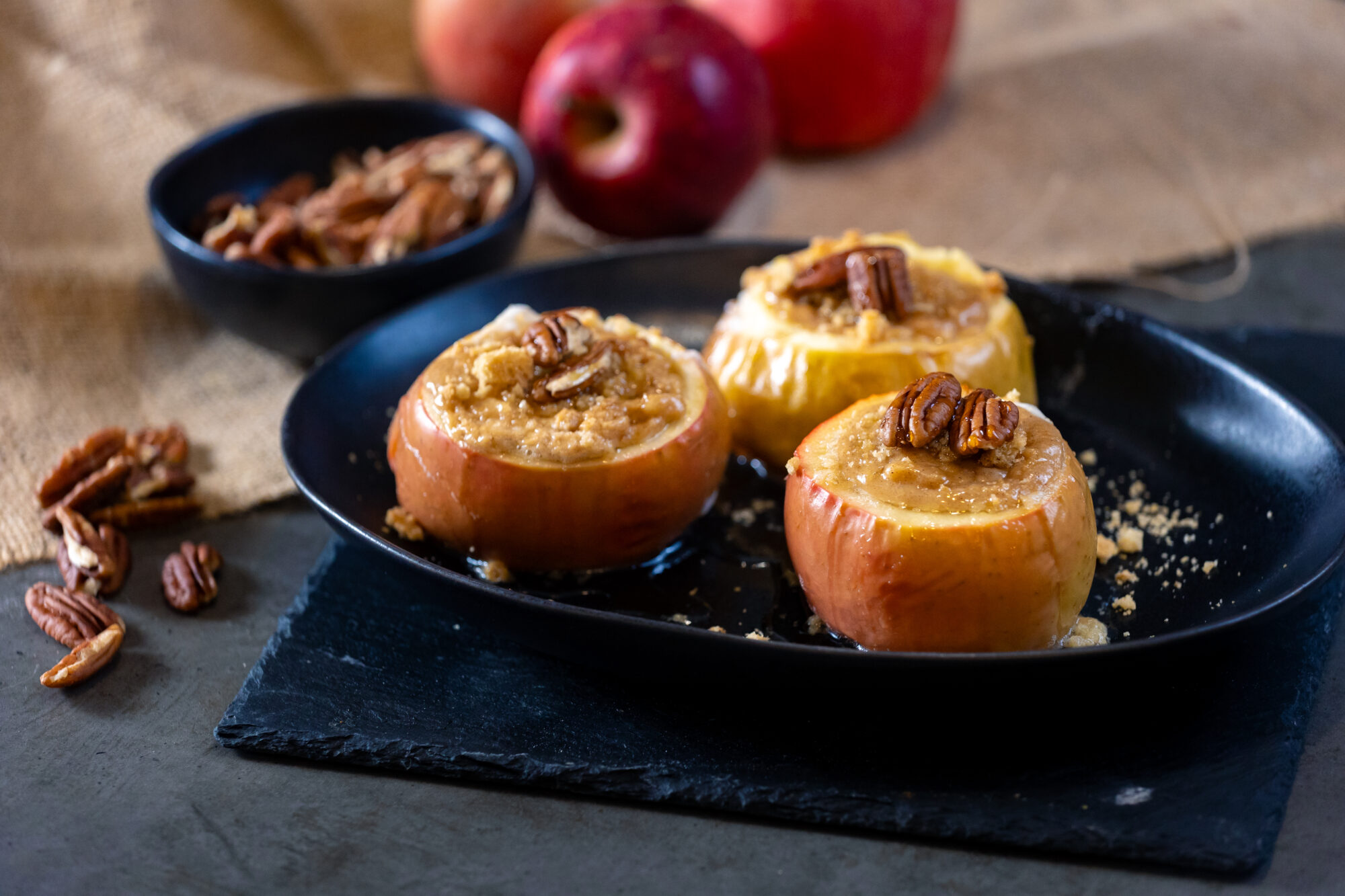 Pečena jabolka po vrhu nadrobimo z zdrobljenimi piškoti, dodamo žlico medu in malo pečenih orehov.