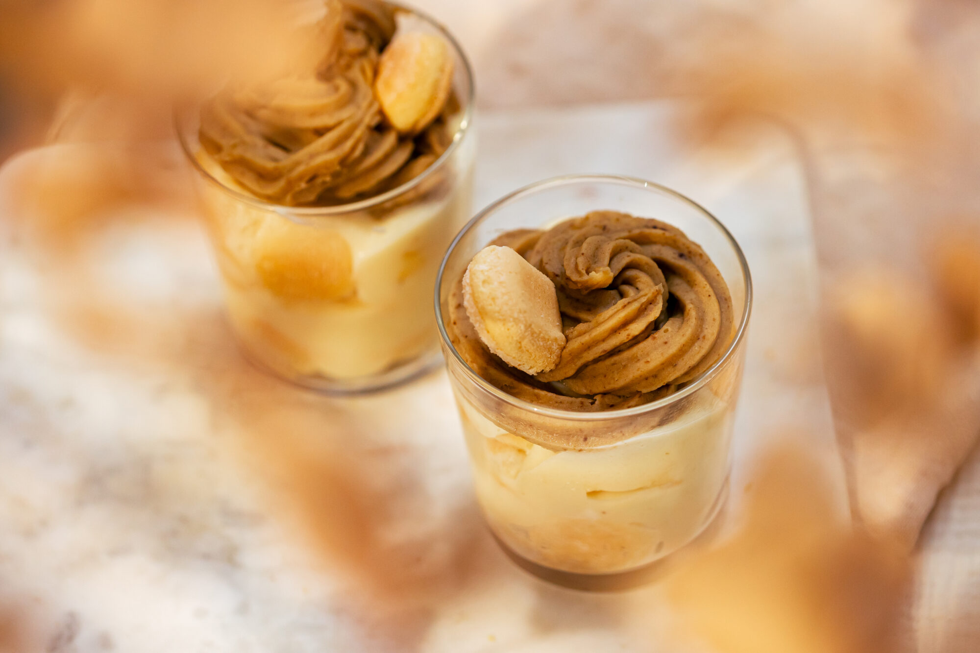 Piškote za tiramisu namočimo v mleku in ji razporedimo po kozarčkih. Na vrh naložimo kremo, plast piškotov in nato zopet plast kreme. Pire kostanja nabrizgamo na vrh in postrežemo.